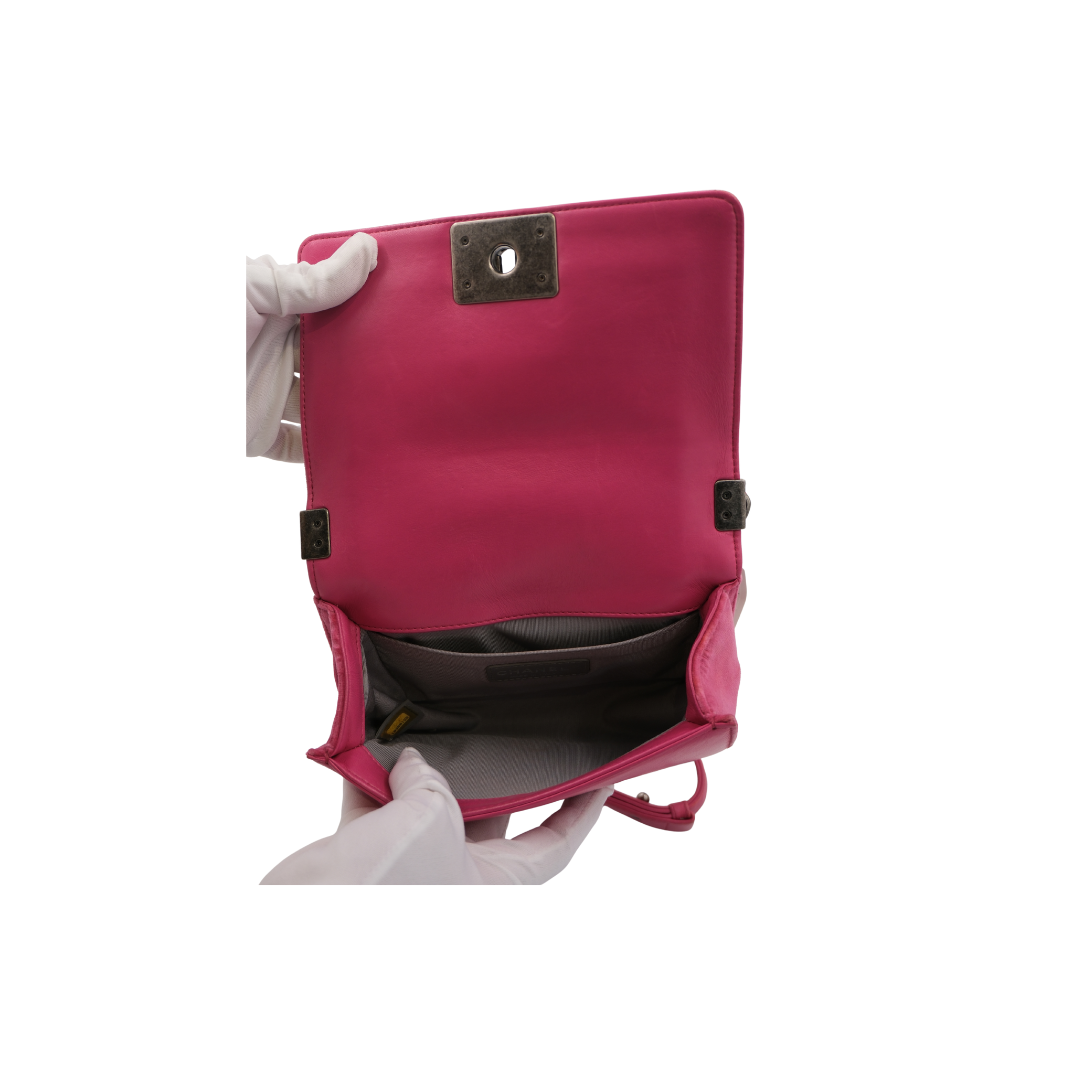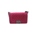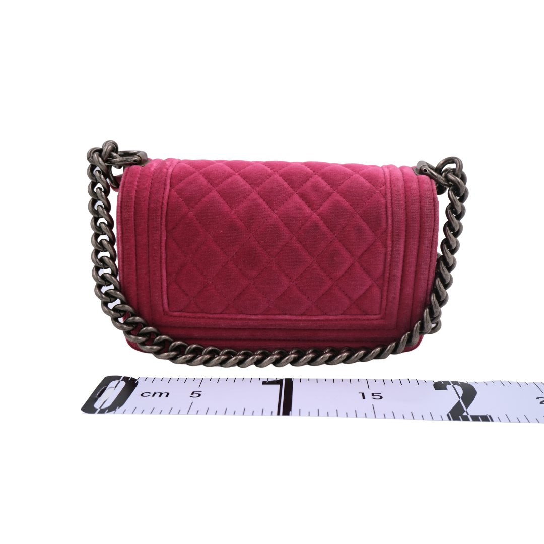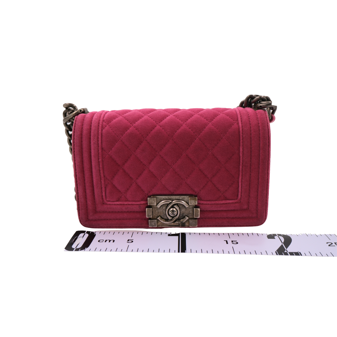 Chanel Small Boy Flap crossbody bag in fuchsia or pink quilted velvet with gunmetal-tone hardware.