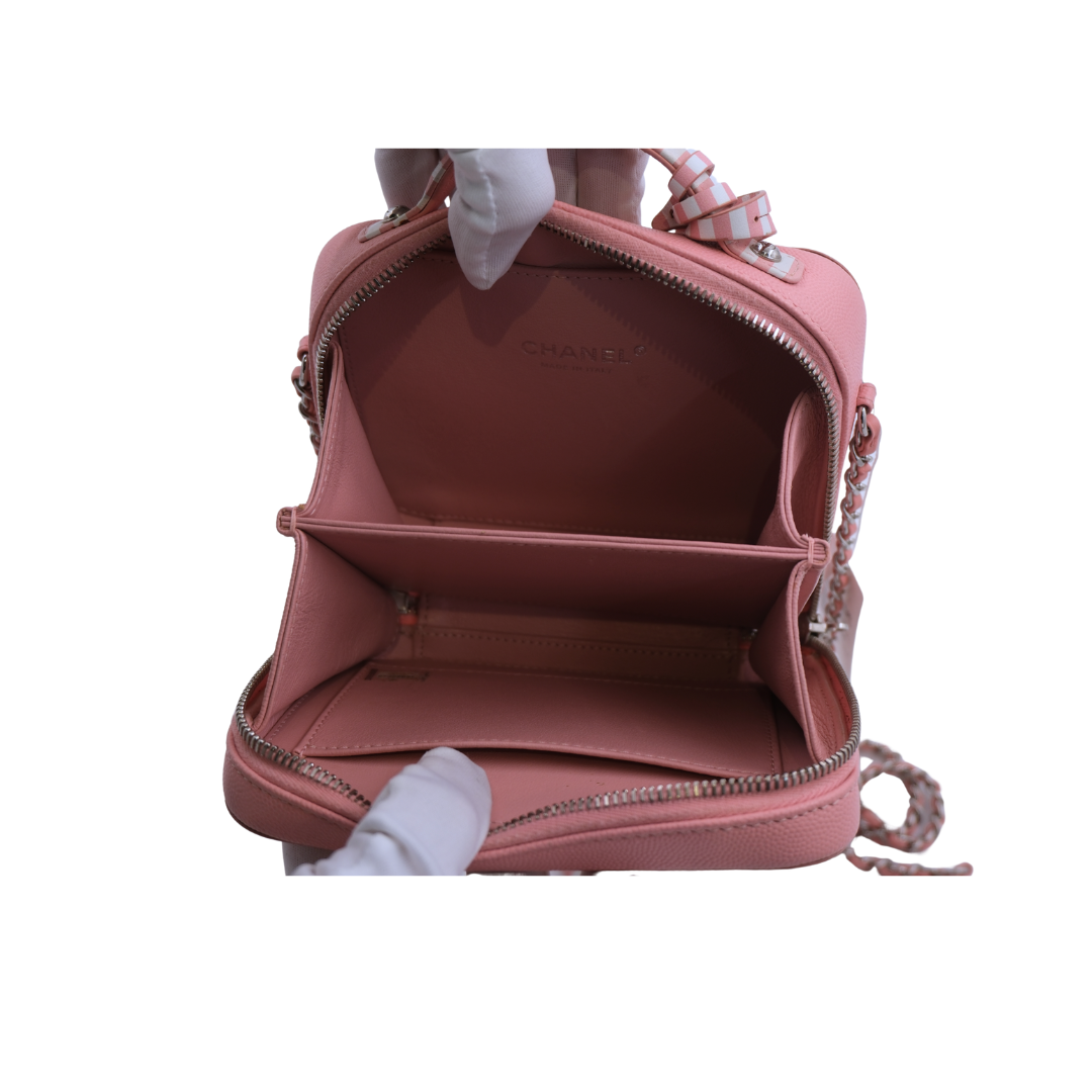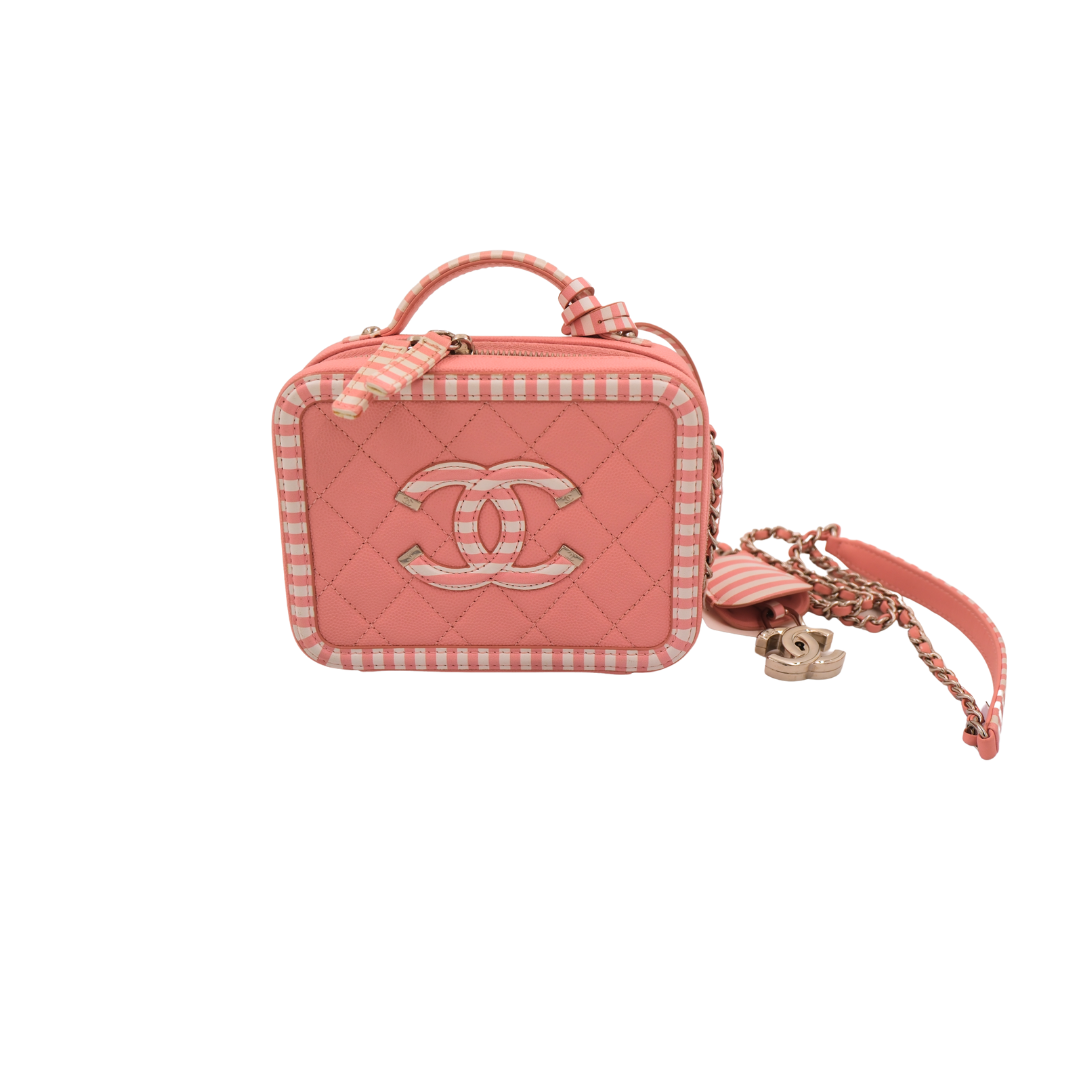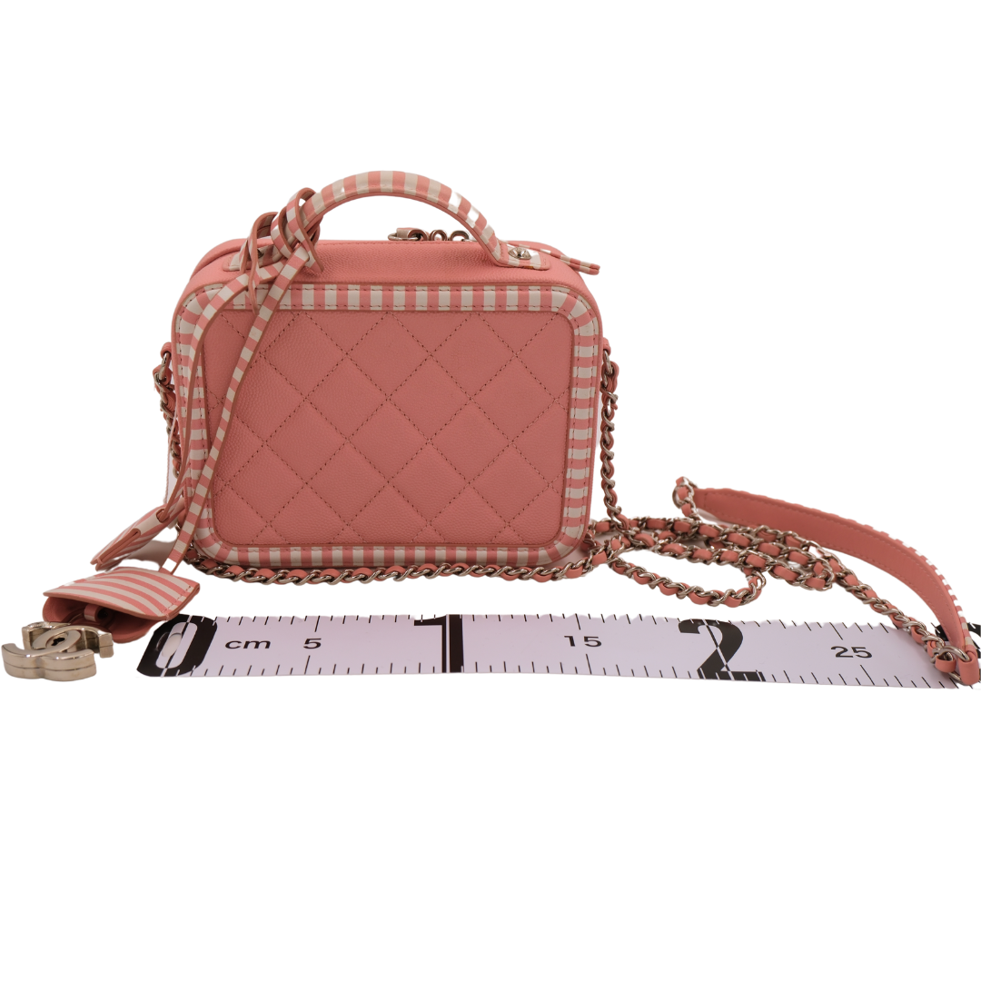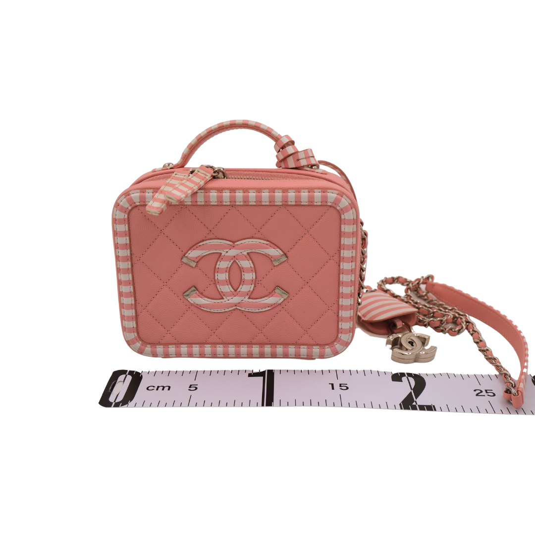 Chanel small CC Filigree vanity case bag in pink and white striped caviar leather