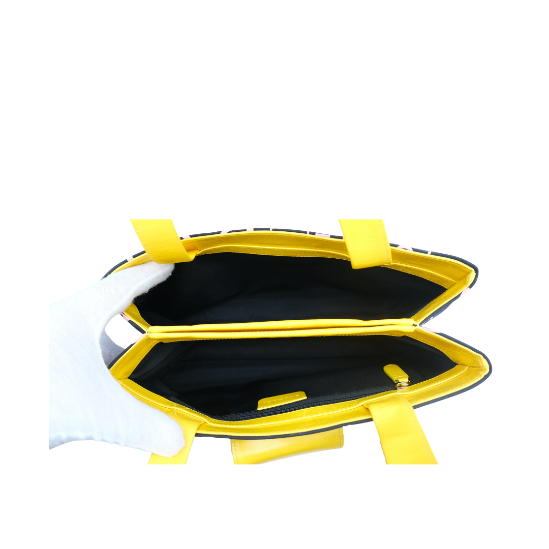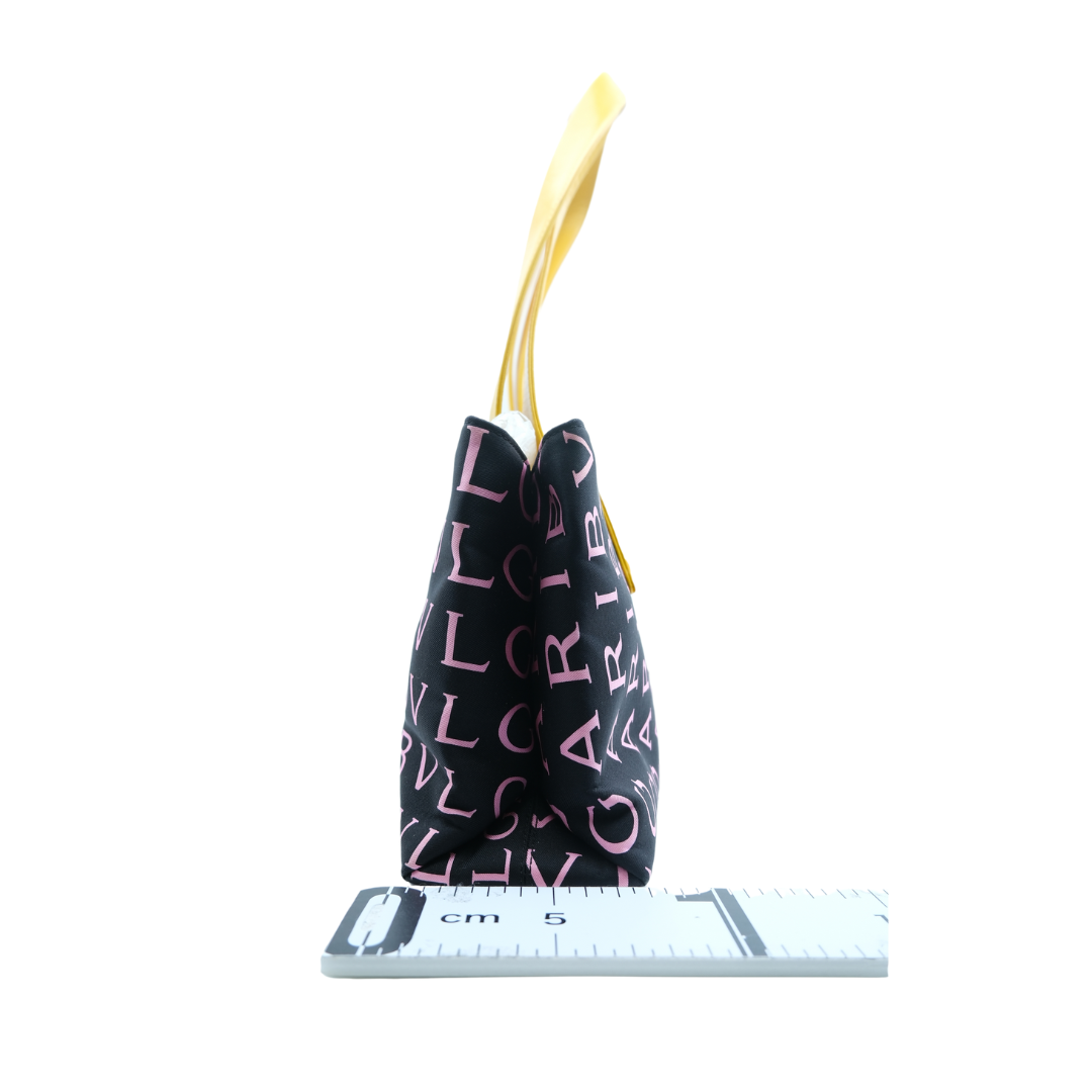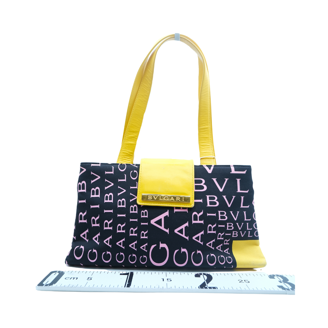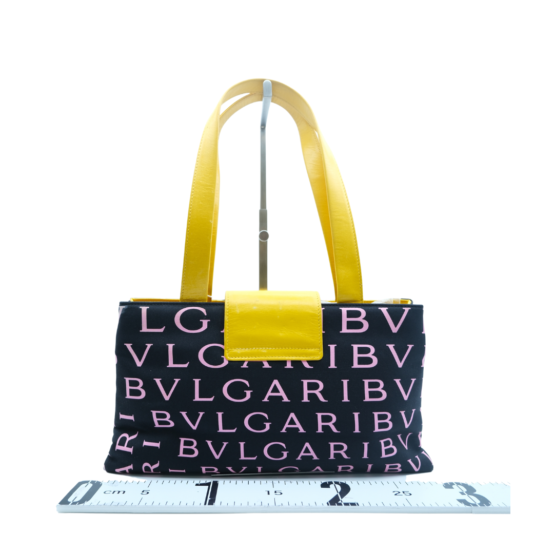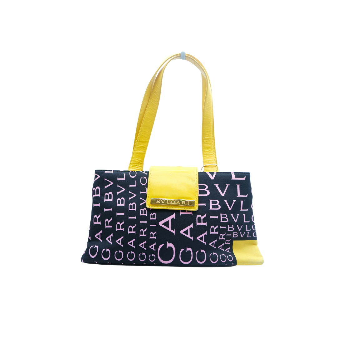 Bvlgari Logomania Small Shoulder Bag in Navy Fabric and Yellow Leather Trim.