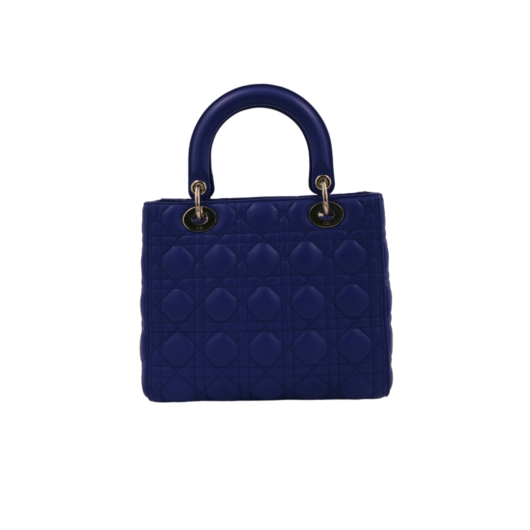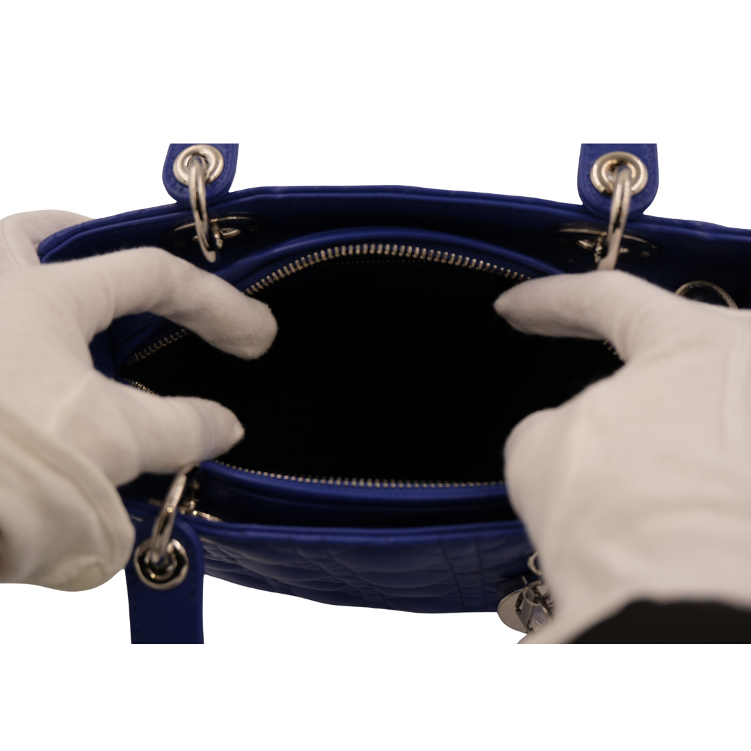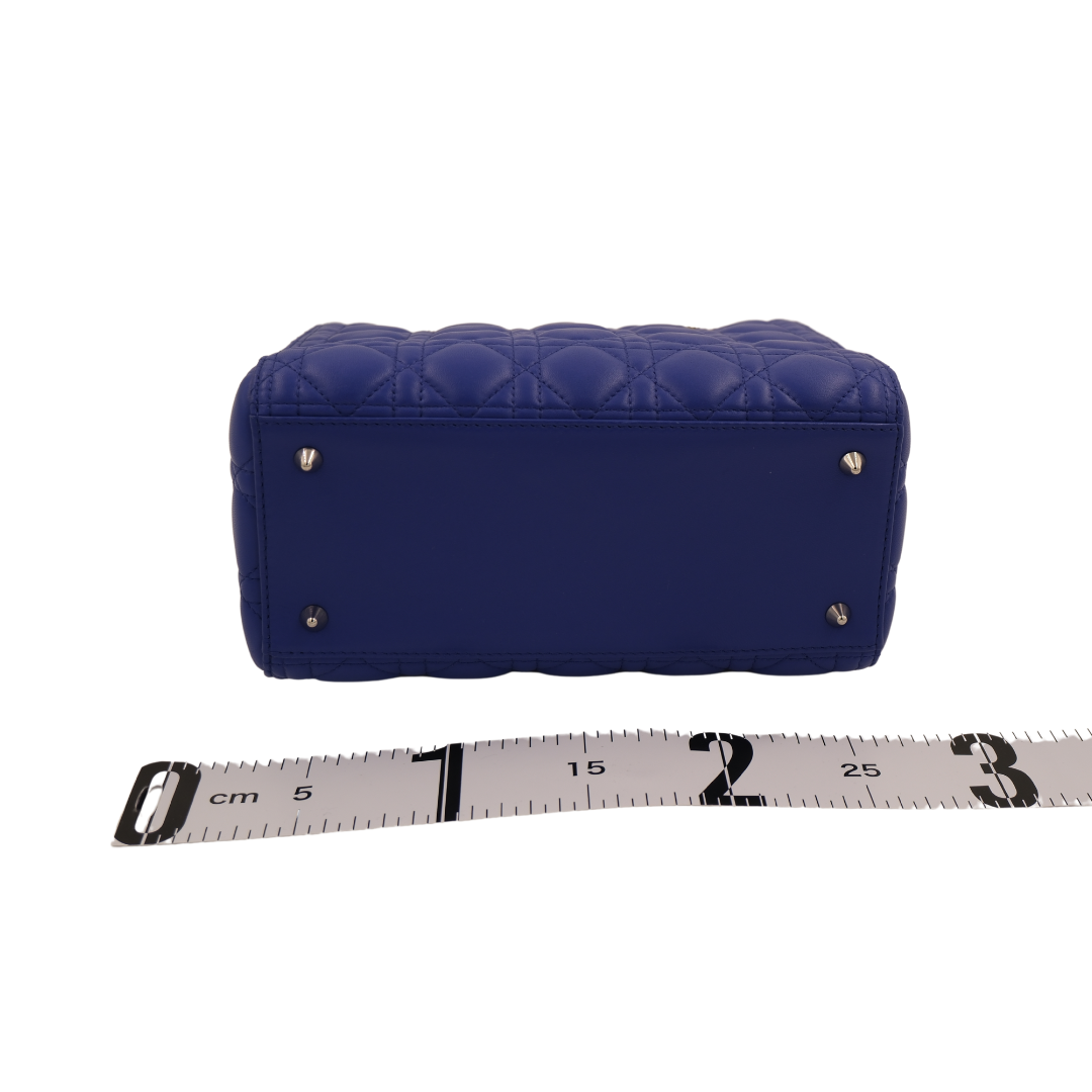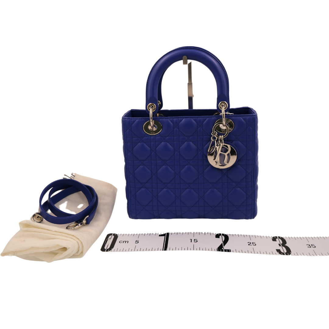 Medium Lady Dior two-way bag in royal blue lambskin leather with silver-toned hardware